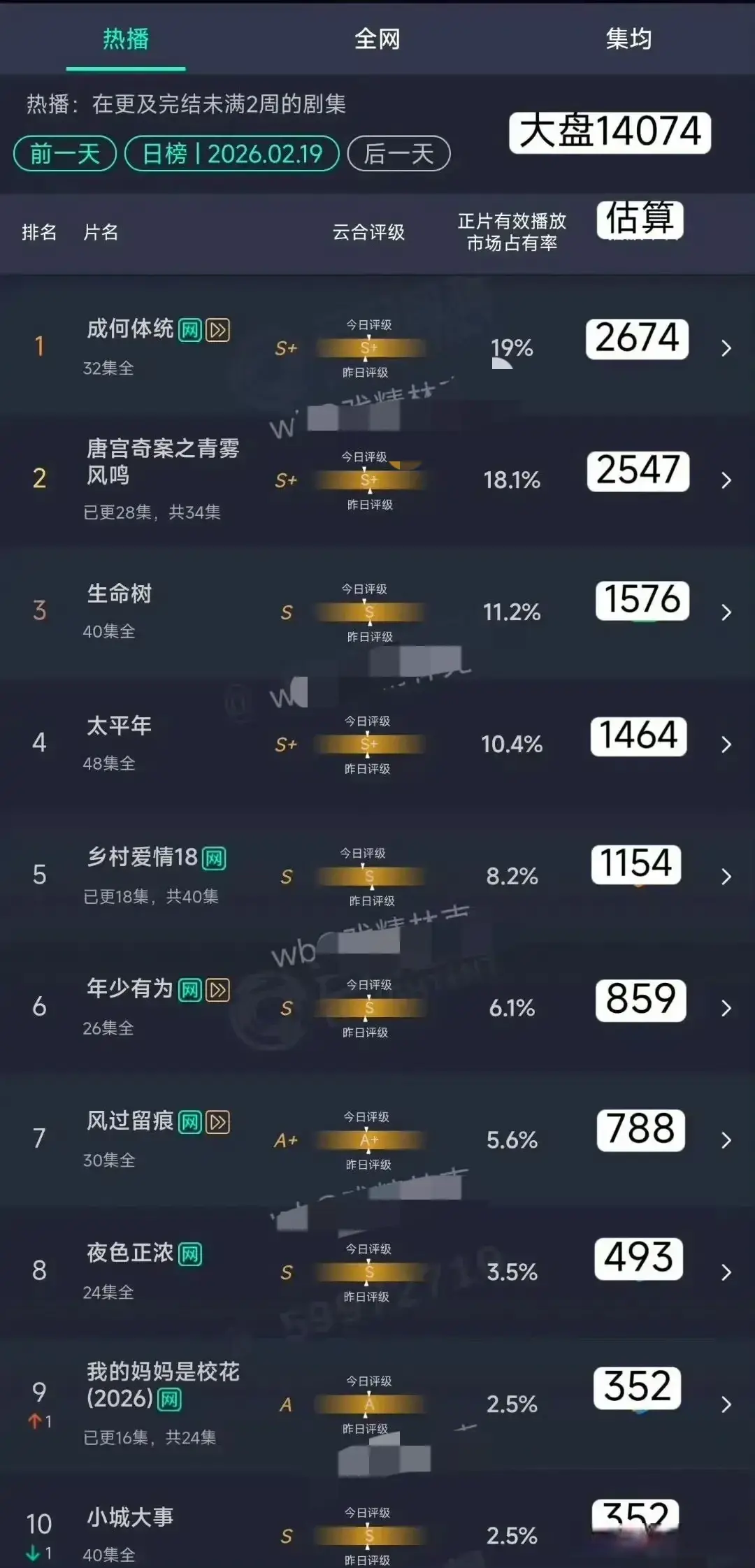 2月中下旬被已兑现的《成何体统》反超:2月18日云合数据判辨,《成何体统》市占率2907万,《唐宫奇案》2584万,连合两天过时。