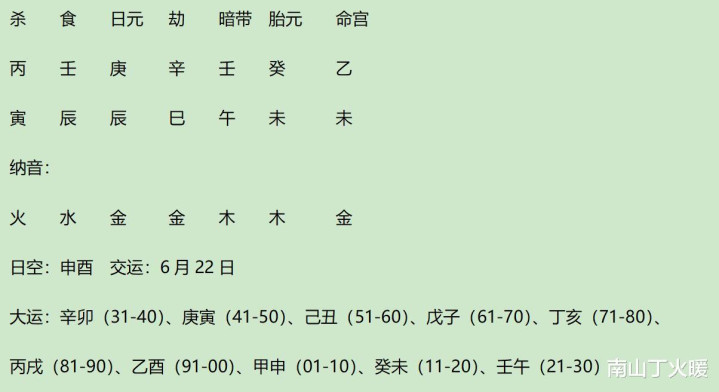 此年,丙杀合辛劫,乙财称身;大运卯与时支巳夹辰,流年子与年支寅夹丑,小限酉与命宫未夹申。