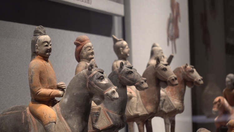 展厅现场,宋绍祖墓葬出土的一组鸡冠帽武士俑