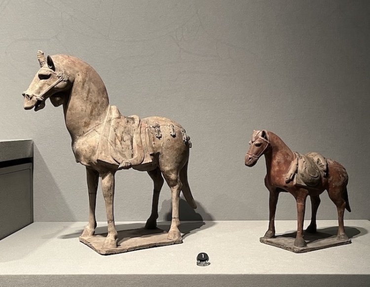 展厅现场,娄睿墓出土的陶马与驮马