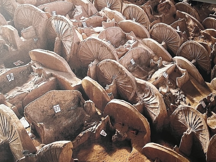 在山西博物院主馆与分馆的展墙上,不错看到对于晋侯车马坑的先容。这是当今发掘的西周时刻最大的车马坑,比秦始皇戎马俑还早600余年,彰明显2800年前晋国强劲的军事实力和文化底蕴。这一车马坑发掘于临汾市曲沃县曲村天马遗迹晋侯坟场,分为马坑与车坑,车坑内共有48辆车,马坑内可数出的马为105匹,均为真车真马。