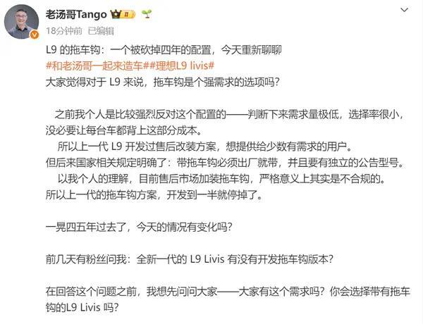 【CNMO科技音讯】4月8日,理念念汽车居品线崇拜东谈主“老汤哥Tango”在酬酢媒体发文,就新一代理念念L9的拖车钩搜集意见。