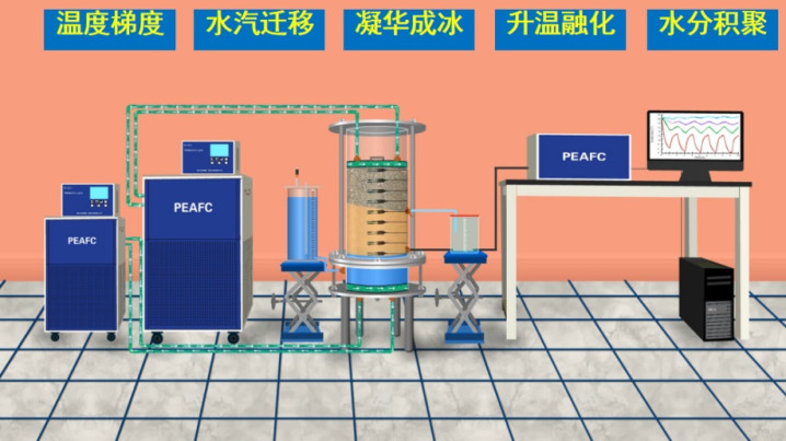 为了严谨考据这一猜念念,姚院士团队自主研发了专用“锅盖效应”造就仪。安设上部模拟低温跑说念,下部拆开为温热土层,中间精确规复跑说念地基结构。造就明晰呈现出齐全轮回:前8天,水汽握续进取移动,附着在干燥砂石名义;第8天后,kaiyun sports砂石吸附饱和,冷凝水初始融会流出,罢了了水汽动态轮回的定量不雅测。该造就齐全准确地捕捉到了“锅盖效应”的全经过,为表面征询与工程应用奠定了坚实基础。