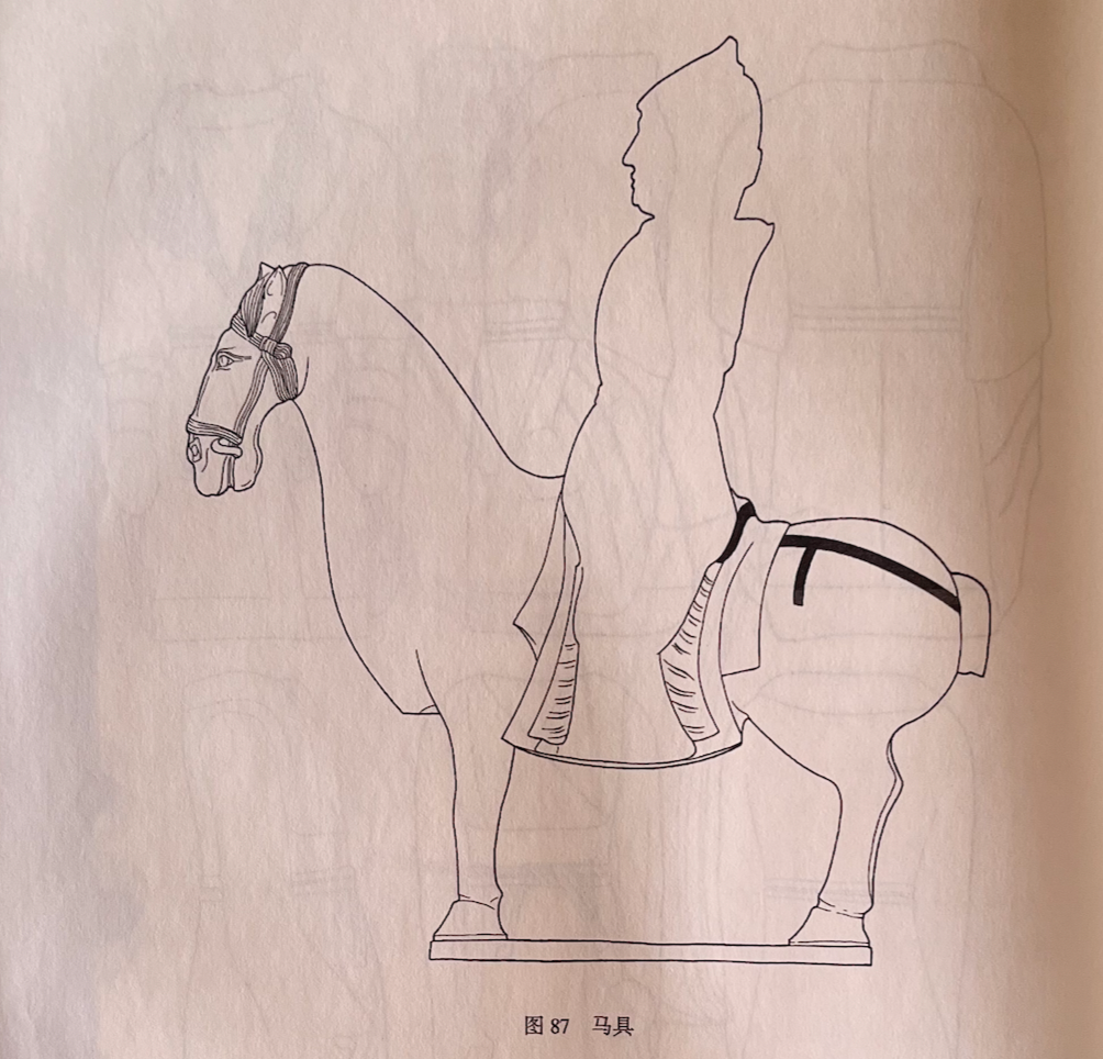 从结构图中可看出,障泥角落以异色宽带包边,质料挺括,忖度为皮革或毡类材质,部分甲骑俑的障泥名义还饰有外相纹样。障泥下方为较宽短的鞍褥(鞯),通常带有包边。