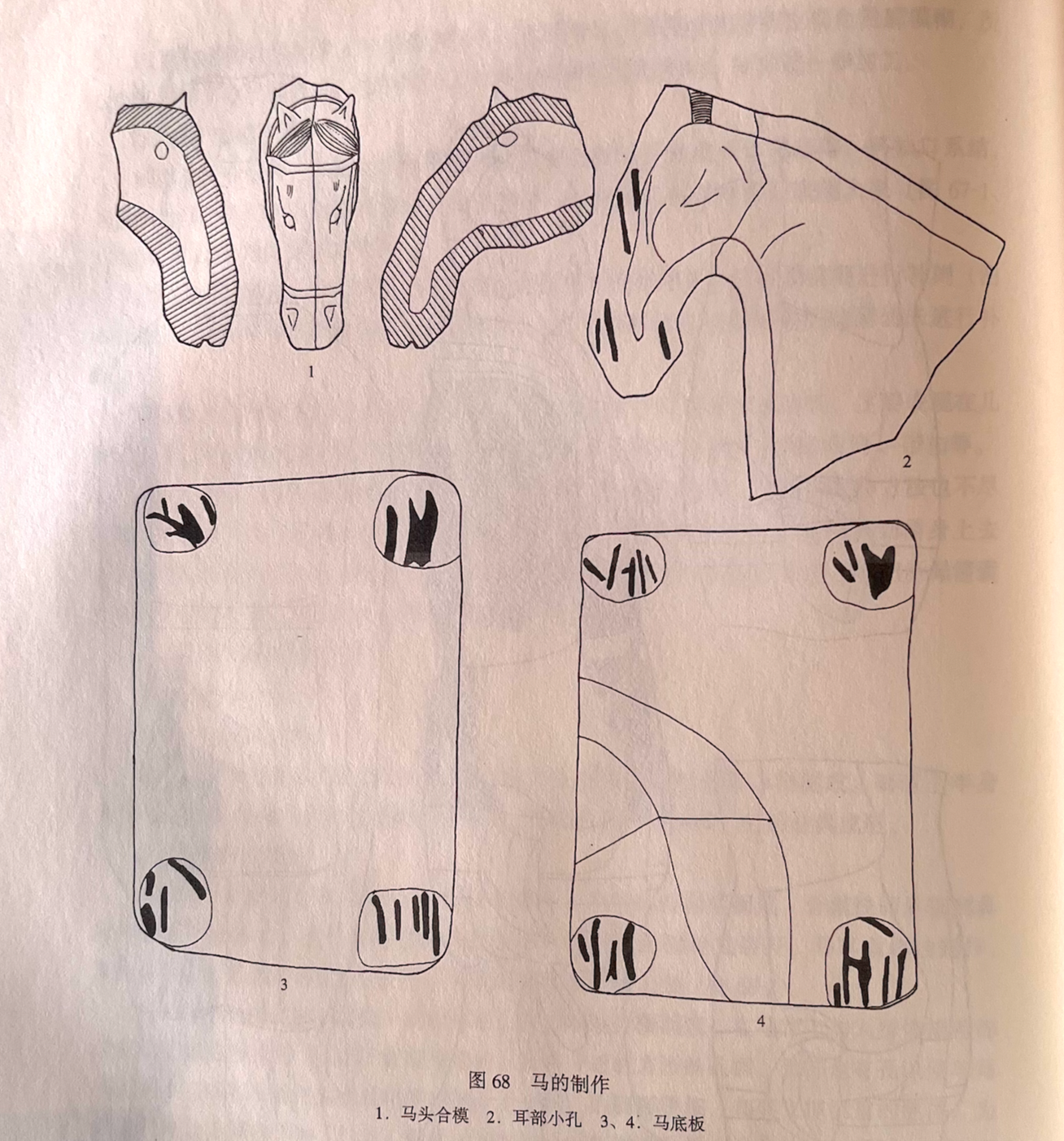 除甲骑具装俑外,陶马的头部均为单独制作,驾御双范合模而成,合模线即从额到鼻的中轴线,出土时有些陶马的头部和马颈已由接缝处裂开。马耳朵单独制作,事前在马头上耳朵的部位钻有小孔,将制好的耳朵安插上去。