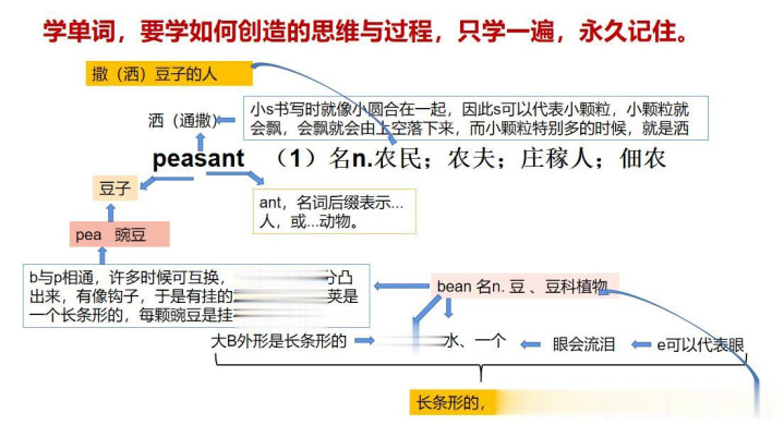当寰球集会到“ant”不错示意“...的东谈主”时,当你遭遇“peasant ”这个单词时,假如寰球没见过这个词,寰球猜这个单词是什么?猜词智力在中国阅读王人荟萃是一种常用手法,其实寰球只消能看到“peasant ”单词中有“pea豆、豆子”和“ant”后缀,基本上就不错猜这个单词了!要是寰球还能知谈“s”不错示意“撒(洒)”!那么你很快就会发现“这个单词就说了一句“撒豆子的东谈主””!那等于具体干农活的东谈主,那等于农民。具体诠释寰球不错看一下图解: