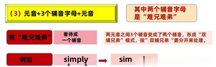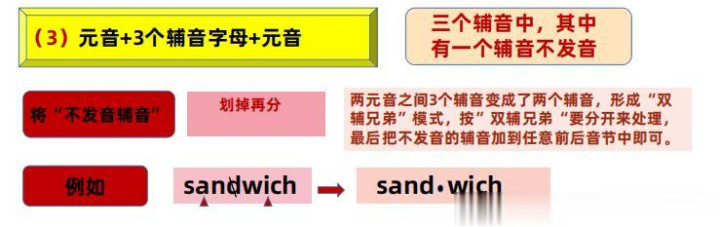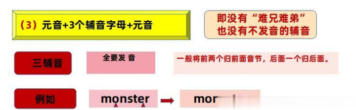 要是两个璀璨之间是三个子音字母,我们的念念想不变,依然是看内部有莫得“难兄难弟”,要是有,我们就不错把三个鼎新成两个,按照一前一后划拨!要是莫得就看有莫得不发音的子音字母,把它先划掉,就由三个变成两个!要是这些都莫得,那等于三个子音都要发音,一般情况就把三个中的前两个子音先划拨给前边元音,背面一个子音归到背面元音!要是遭遇二般情况,寰球就需要动用音变理念处理问题了。笃定请看诠释图。