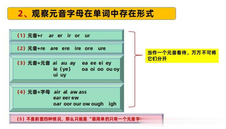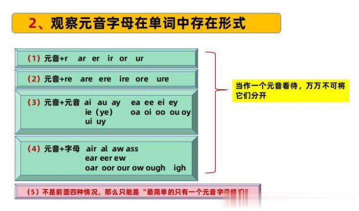 寰球见到任何一个单词时,从赶赴后找,当你找到第一个元音字母时,当场不雅察一下,这个元音字母背面有莫得紧跟r字母酿成ar、er、ir、or、ur神色或紧跟re字母酿成are、ere、ore、ire、ure神色,或者你找到的元音字母有莫得再紧跟一个元音字母酿成ai、ay、au;ea、ee、ei、ey;ie、ye;oa、oi、oo、ou、oy神色,或者是元音字母背面跟了其他子音字母酿成这样的组合air、al、aw、ass、ear、eer、ew、oar、oor、our、ow、ough、igh!要是出现这四种情况,把这些看待成一个合座!当作念一个元音!在他们的底下作念好璀璨,如一个小三角形或圆圈或圆点!要是莫得出现上头所说的四种情况!平直在找到的元音字母底下作念璀璨!对于为什么上头四种情况要行为一个合座,当作念一个元音,想不解白的淳厚或家长不错在微信留言问我!当今寰球要点阅读底下的“不雅察元音字母在单词中存在神色”图。