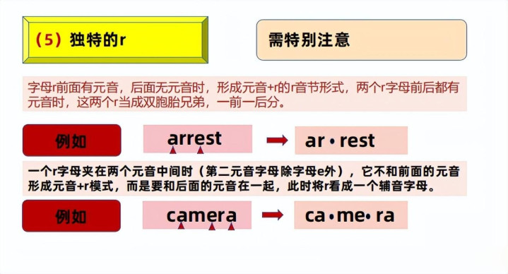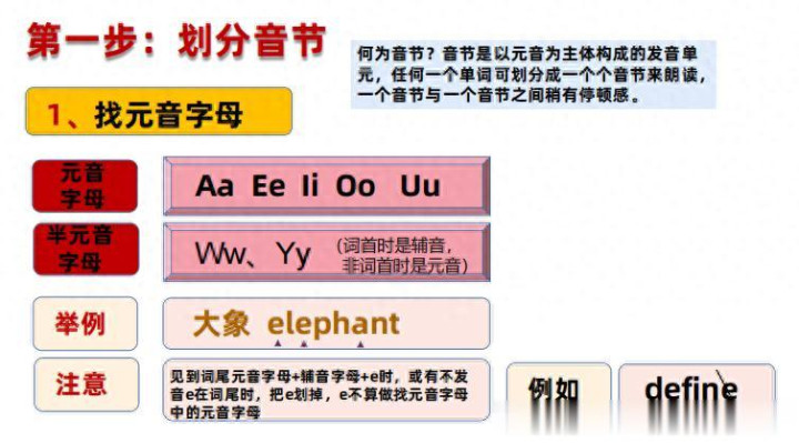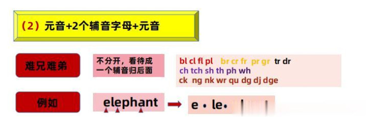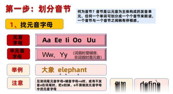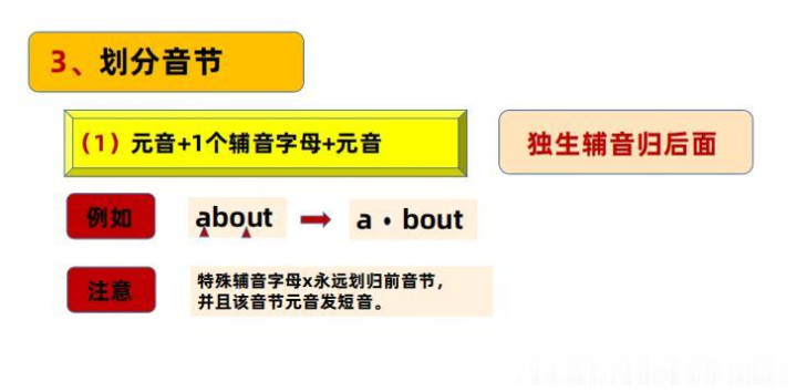 就这样我们就不错将任何单词幽静地、准确地进行阔别音节!关键念念想我再次作念一个强调!阔别音节,找元音是关键,找到元音作念好璀璨,中枢念念想等于看璀璨之间的子音字母情况!