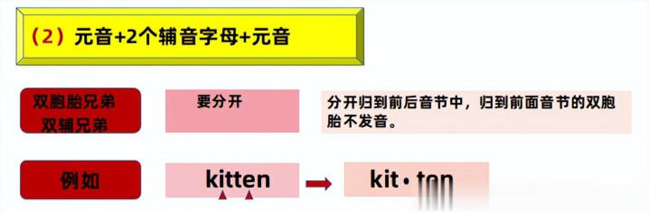 字母既不是一个,也不是“难兄难弟”!那就将这两个子音字母(双辅昆季)一前一后划拨给我们璀璨好的元音!要是这两个子音字母是不异的,这种我们不错将其称为“双胞胎昆季”,他是包摄于一前一后划拨!只是划给前边的阿谁子音双胞胎之一不发音!”,寰球一定要读懂,唯独“双胞胎昆季”里划到前边音节的阿谁子音双胞胎之一不发音!要是是“双辅昆季”,尽管一前一后阔别了他们,但他们都发音!