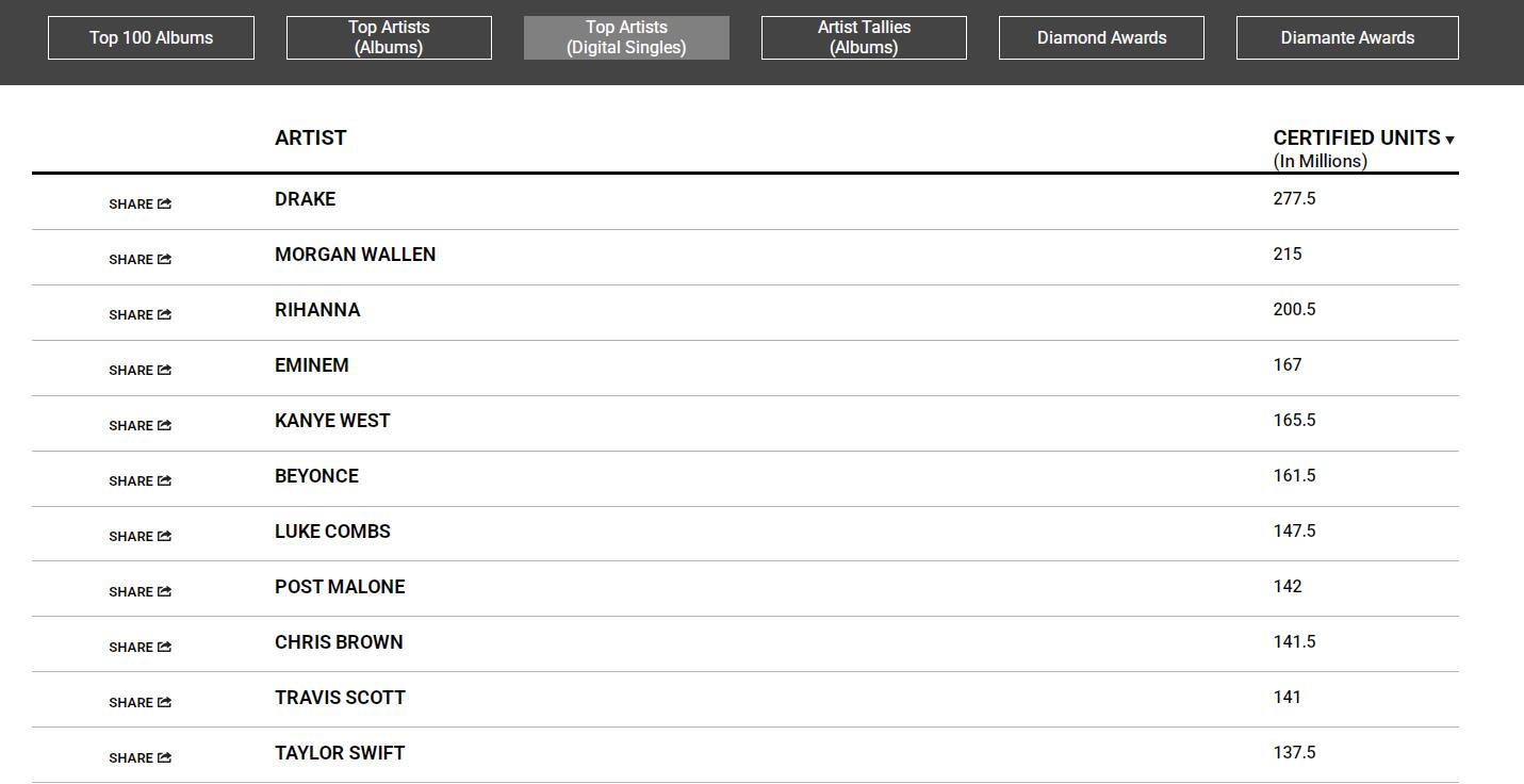 据《滚石》杂志报谈,松手当地时刻4月15日,蕾哈娜(Rihanna)成为首位好意思国唱片业协会(RIAA)认证的单曲销量冲突2亿张的女歌手,位列榜单第三,仅次于德雷克(Drake)和摩根·沃伦(Morgan Wallen)。