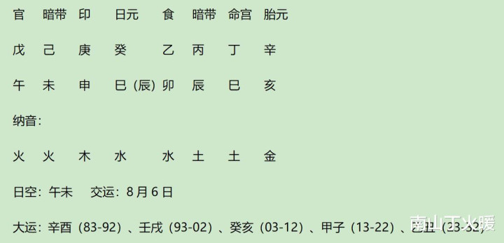 年透戊官,暗带透己杀,地支得1午1未2巳2辰、2纳音土助,纳音火生,戊官是3强根力量,己杀亦然3强根力量,取七杀格。七杀得6强根力量,过强水平。