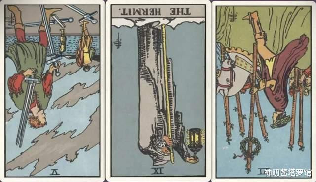 牌:宝剑五- 隐士- 权杖六-
