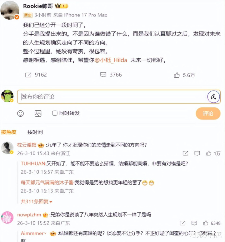 不错看到,Rookie奏凯发文了,咱们也曾分开一段时间了,离婚是我建议来的,不是谁作念错了什么,而是肃肃聊过之后,发现对将来的观点地点不同。感谢邂逅和伴随,但愿小钰将来一切都好。看到这个官宣,有网友们尊重聘请的,也有示意寥落不睬解。比如,为什么相处9年了,才发现将来的观点不同呢?这个原理有点太牵强了吧,不爱就不爱了,不要说别的原理。