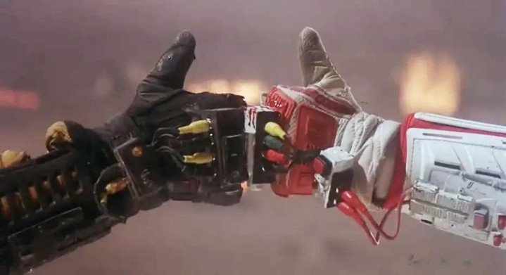 莫得花里胡梢的光炮,即是纯纯的钢铁肉搏,过肩摔、锁喉、拿钻头怼脸。细目会有东谈主说特 效太假了,模子感太重了,对,你说的没错,但恰是那种实打实的模子拍摄,才有当今CG作念不出的金属质感。