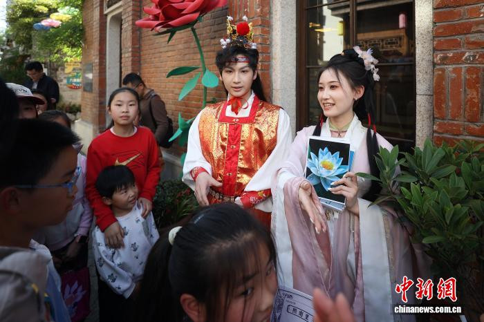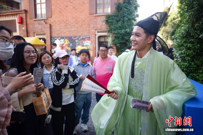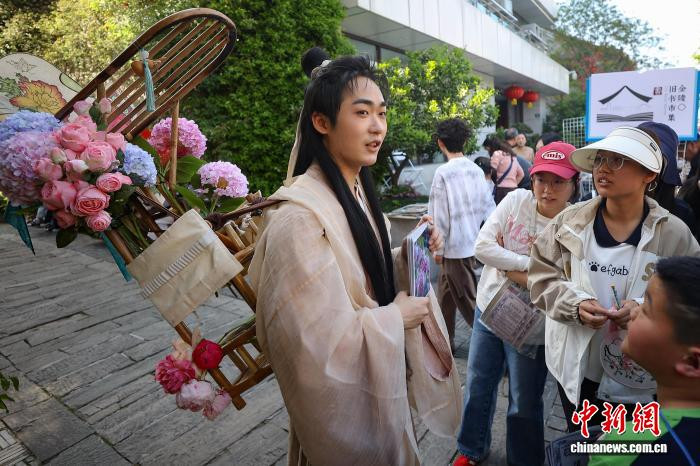 4月19日,江苏南京,古装打扮的年青东谈主在金陵古书商场上与市民互动。日前,以“古书新知书香南京”为主题的金陵古书商场在城南古巷熙南里街区开启,遮掩古古书市、古籍科普、以旧换新、非遗工坊等七大类别,一站式得志民众淘书、研学、互动、滥用等多种需求。中新社记者泱波摄